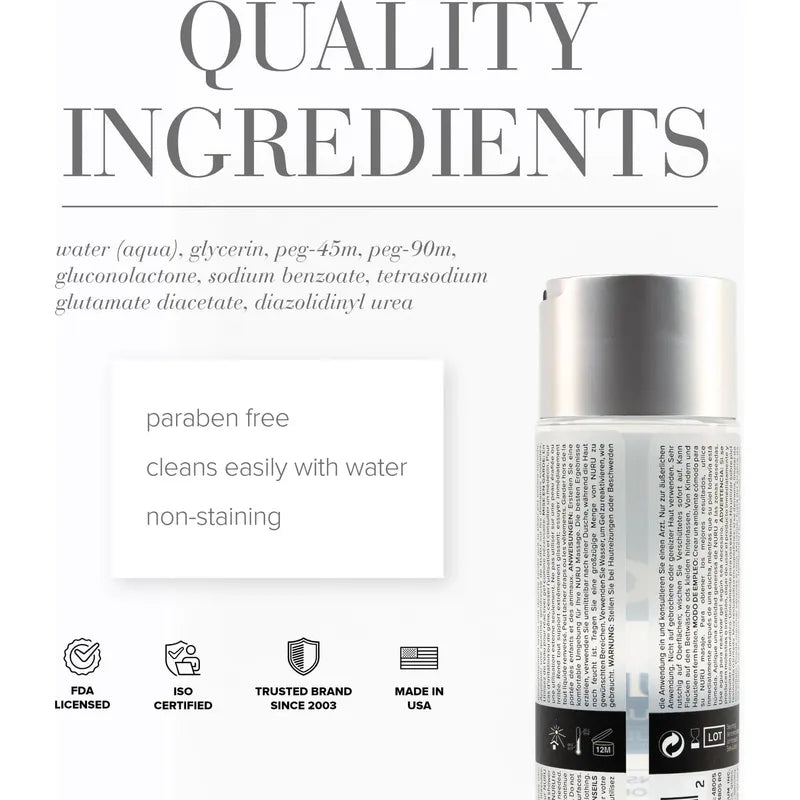 Apply NURU when skin is wet or damp and use water to maintain glide.