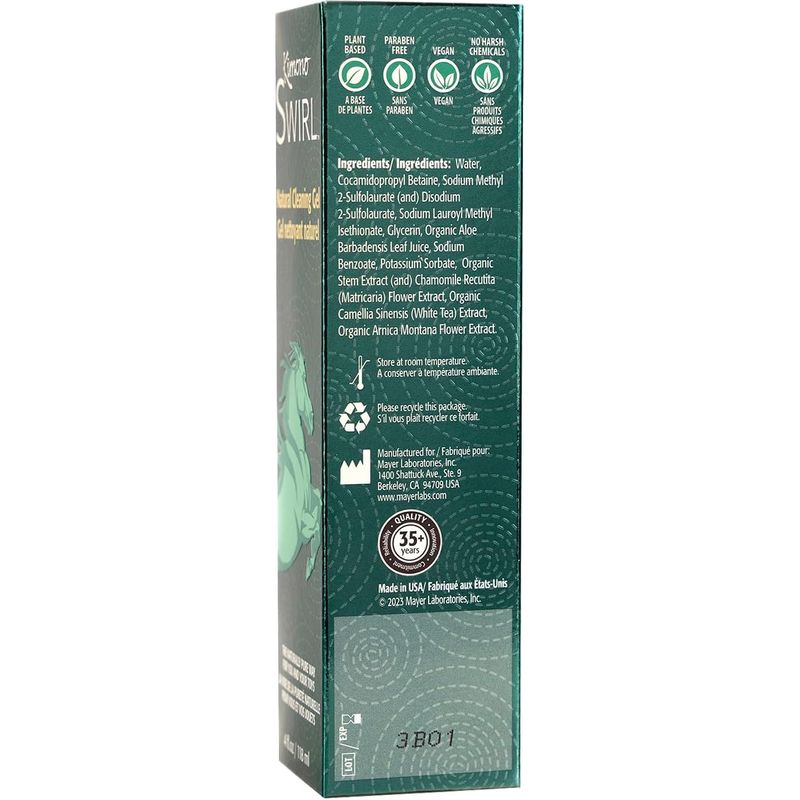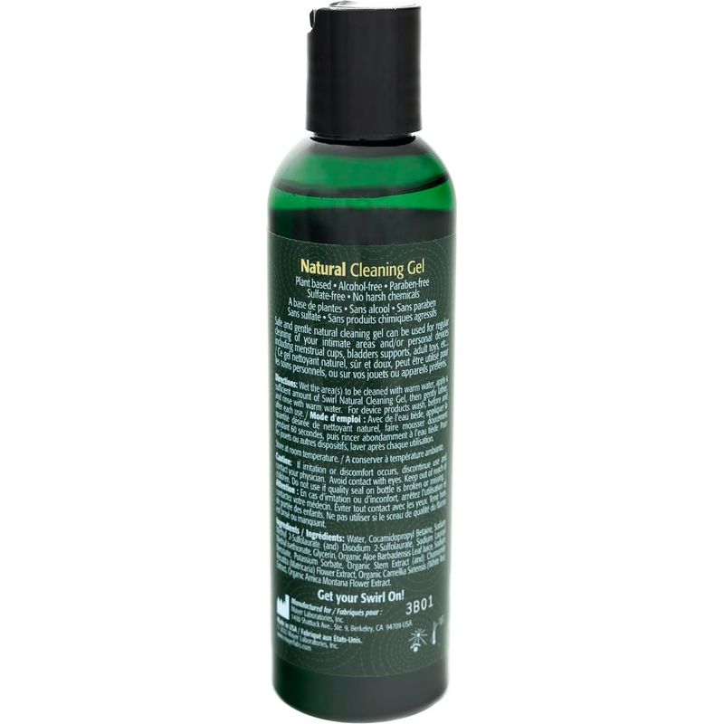 - Swirl Natural Cleansing Gel contains botanical wonders like chamomile and camellia, among other ingredients, to gently and decisively clean your toys, body and personal care items.